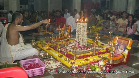 The Puja which included a Bhagawati Seva performed by Br.Snehachandran, commenced at 6.30 pm. Br. Avyayamrita Chaitanya, head of the Mumbai Ashram centre, then addressed the gathering. In his address, Swamiji extolled the virtues of great devotees of Lord Krishna such as Arjuna, the Gopis, Radha, Mirabai and others. Amma says each one of us has a hotline to God, but the quality of the line depends on the intensity of our prayer. God is ever willing to pour His Infinite grace into each of us, depending on the ‘vessel’ one has to receive it.The talk was followed by a guided meditation session. As the Puja progressed, the Ashtothram and the Lalita Ashtothara were chanted by devotees participating in the Vilakku Puja. A couple of soulful bhajans set the tone for contemplation as everyone joined in. The Puja concluded with the Mahishasura Mardini Stothram and the Maha Arati after which Mahaprasad was served to everyone.