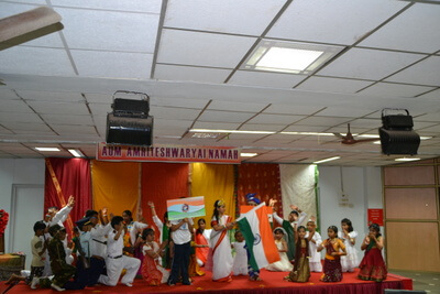 Swamiji’s speech was followed by speeches by the children in English, Hindi and Marathi. The topics were varied such as “The India of my Dreams’, ‘What is True Freedom?’ and ’65 years of Indian Independence’. The children then sang a couple of bhajans that had a soothing effect on the audience. Thereafter, a dance-skit portraying the incredible Indian spirit in times of crisis was presented. A medley of patriotic songs and a slide show about India’s greatness were a part of the dance-skit that added a nationalistic flavor to it. Finally, the National Anthem was sung. Snacks were given to all those assembled and the event concluded on a patriotic note.