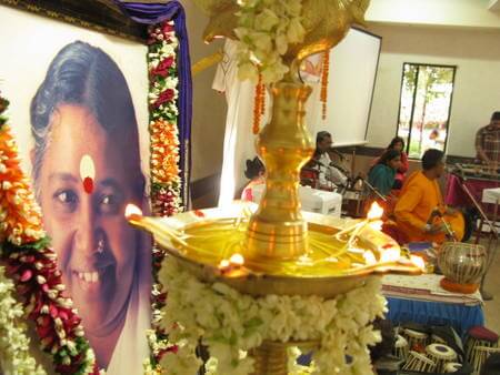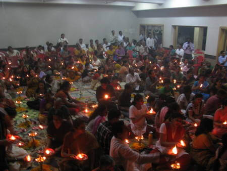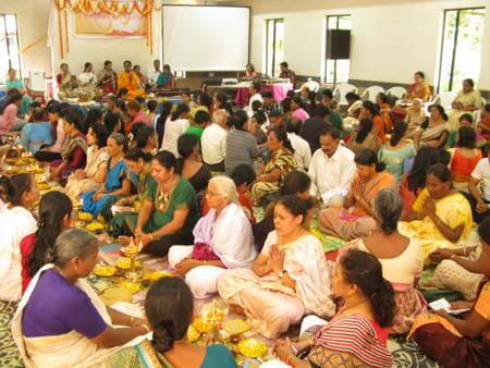 The clubhouse at the Raheja Estate, Borivli was the venue of a Lalita Sahasranama Archana and Vilakku Puja on Saturday, June 2, 2012, conducted under the auspices of the Mumbai Ashram. The participants in the Puja, comprising the very young to the very old, were mostly the locals of this western suburb of Mumbai, though a good number of devotees from other parts of the city also attended with enthusiasm.