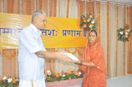 As part of charitable activities, clothes were donated to 100 poor and needy ladies from around the Ashram, before Mahaprasad.
